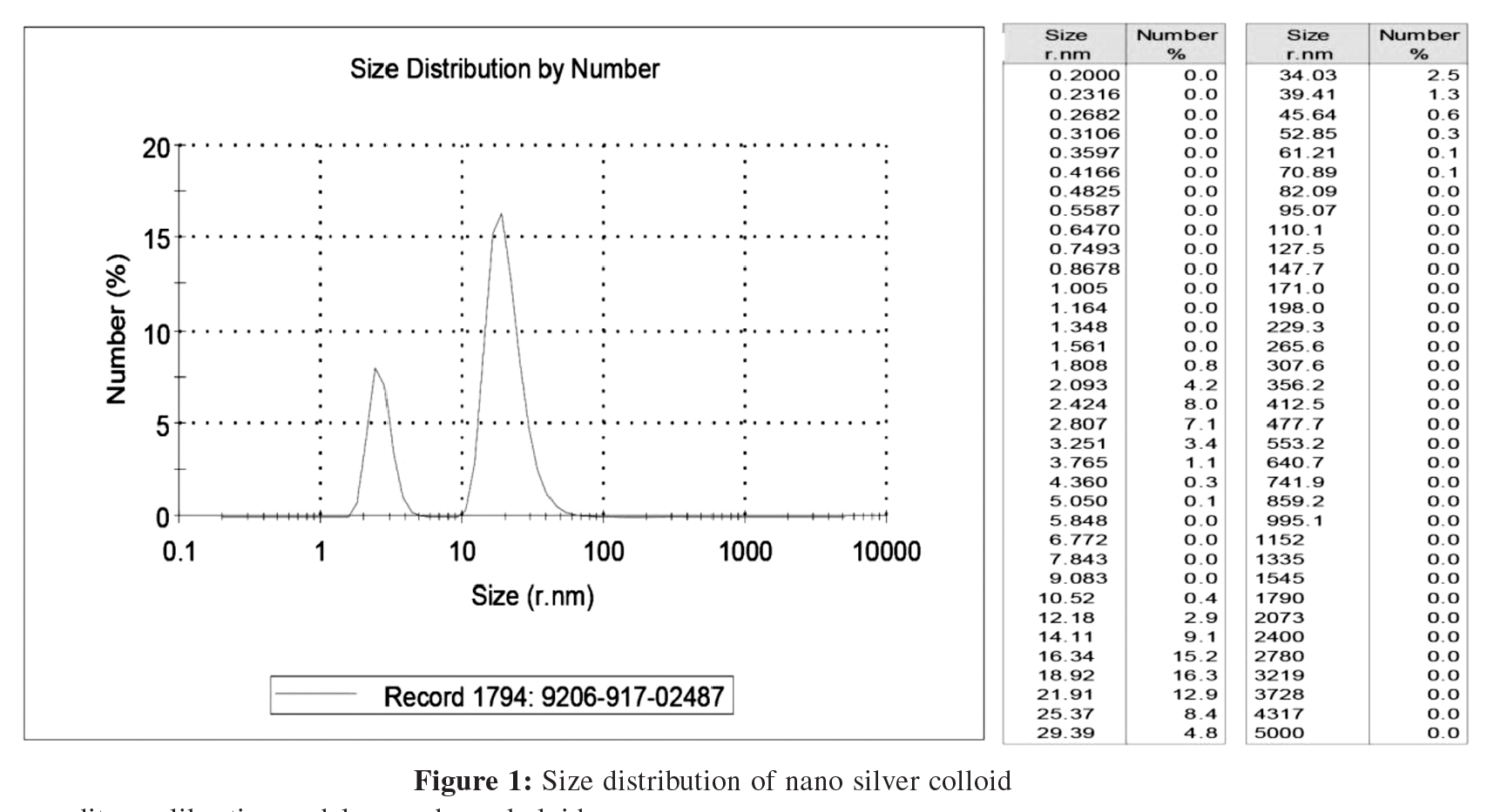6.1 Particle size distribution of nano-silver colloid The particle size distribution of the nano-silver colloid was measured using the DLS method. The results showed that the average size of the nano-silver colloid and the Pdi constant were about 49.08 nm and 0.408 nm, respectively. Figure 1 shows the size distribution of the nano-silver.