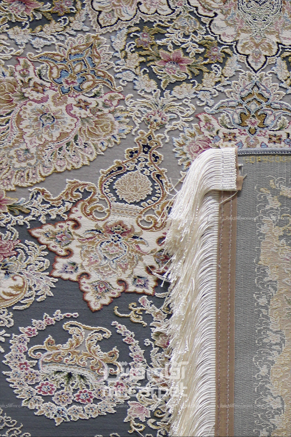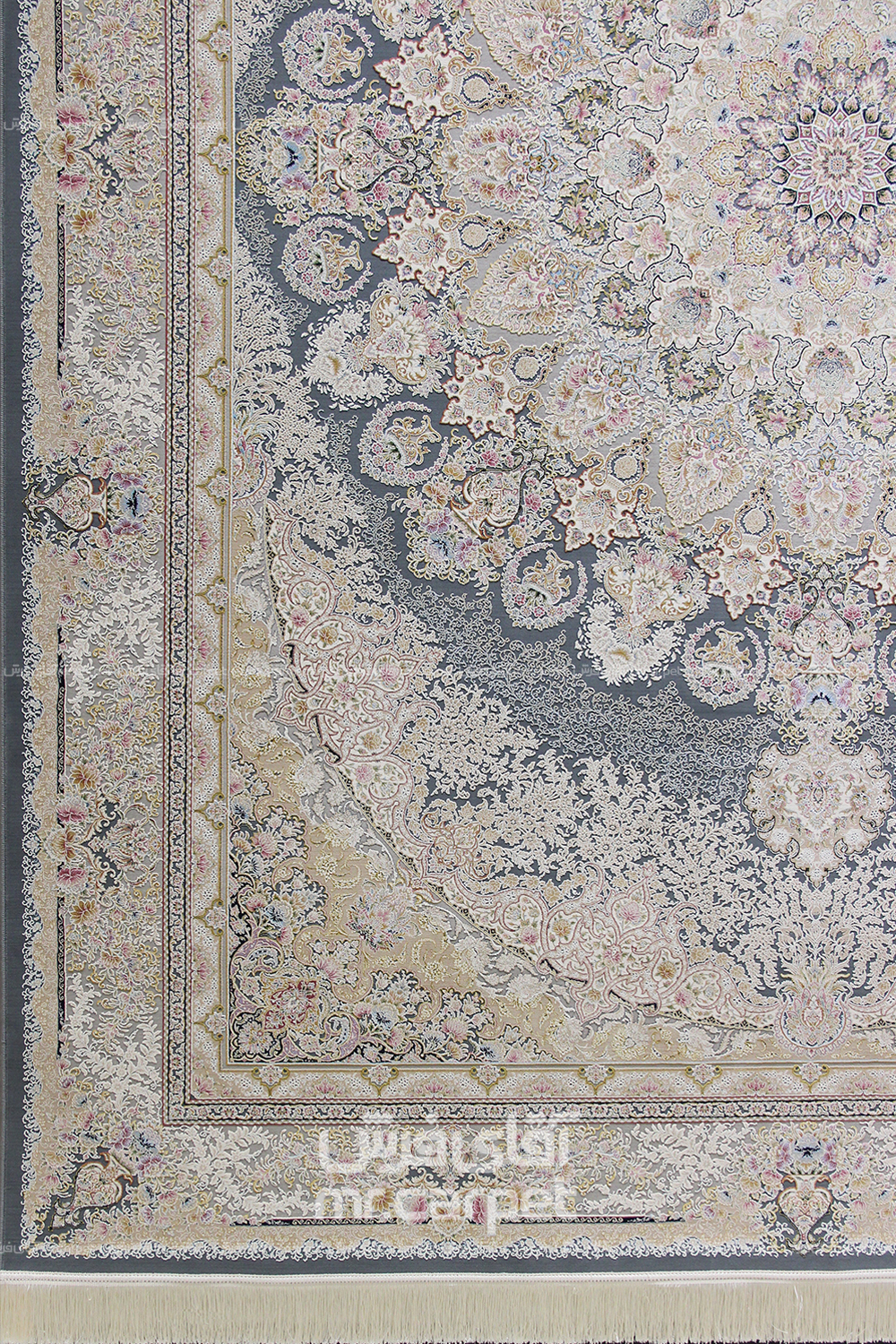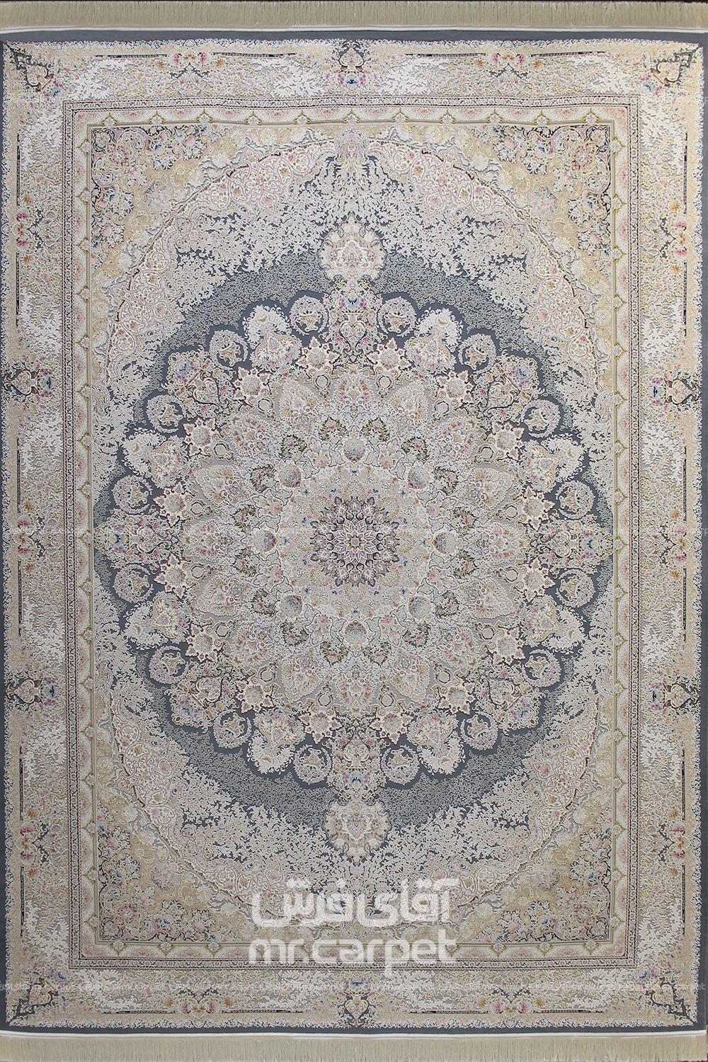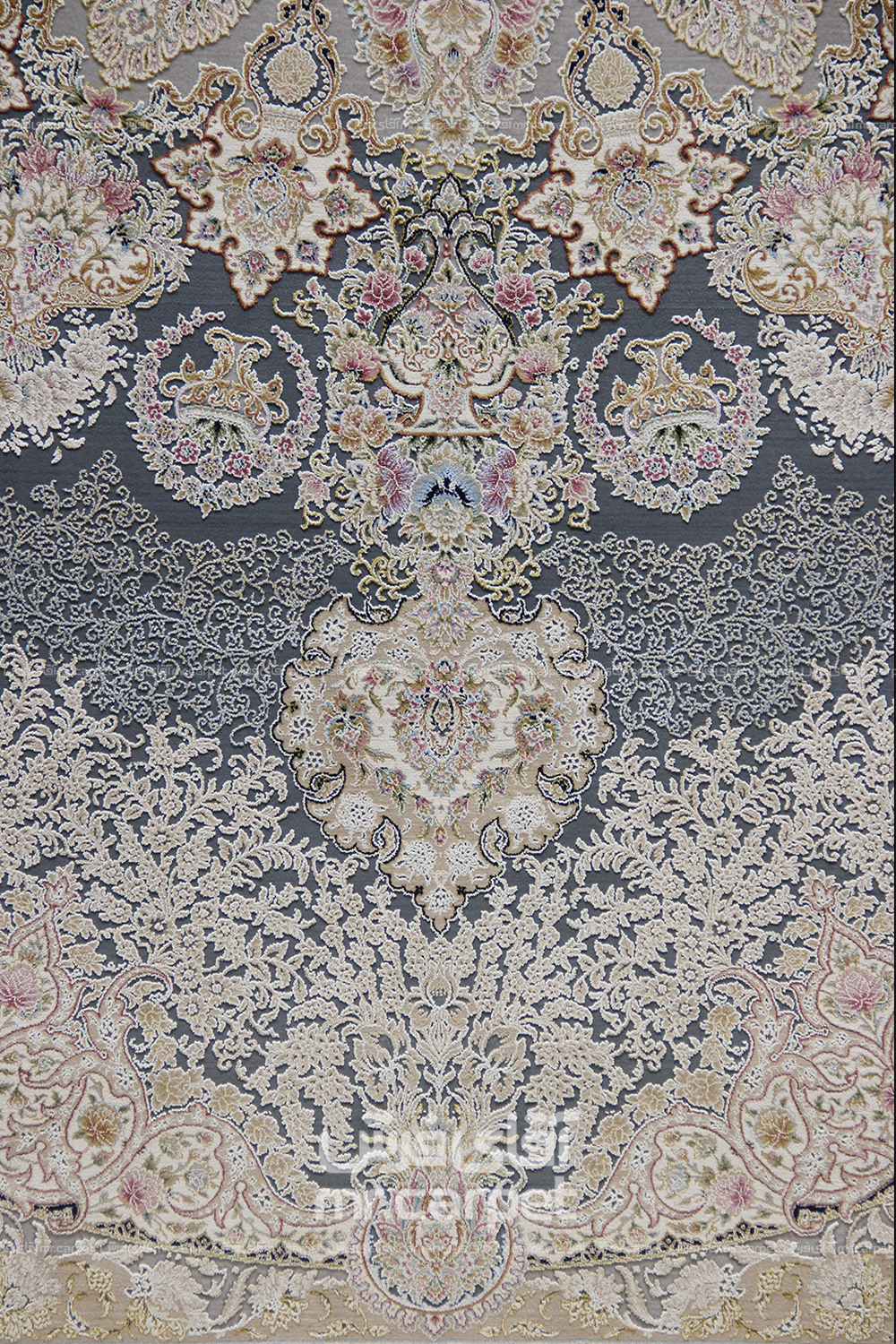 فرش ماشینی کلاسیک طرح آنوشا نمونه 1 آبی دودی 1500 شانه پلی استر-اکرلیک فرهی