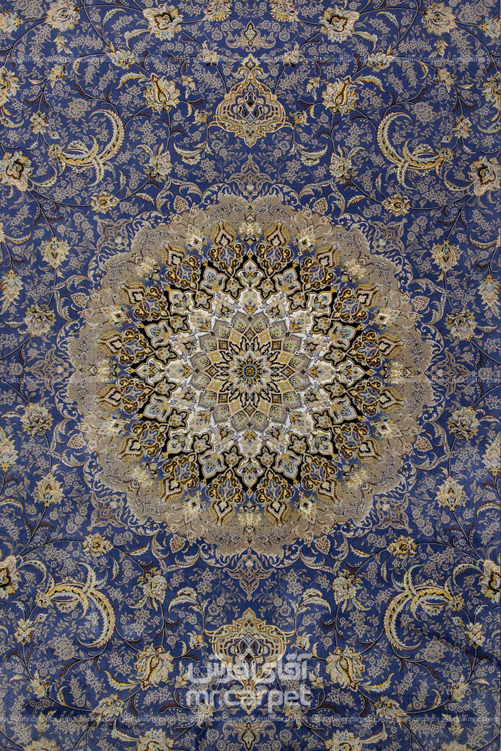 فرش ماشینی کلاسیک طرح شاه پسند نمونه1 آبی اطلسی 1200 شانه پلی استر-اکرلیک فرهی